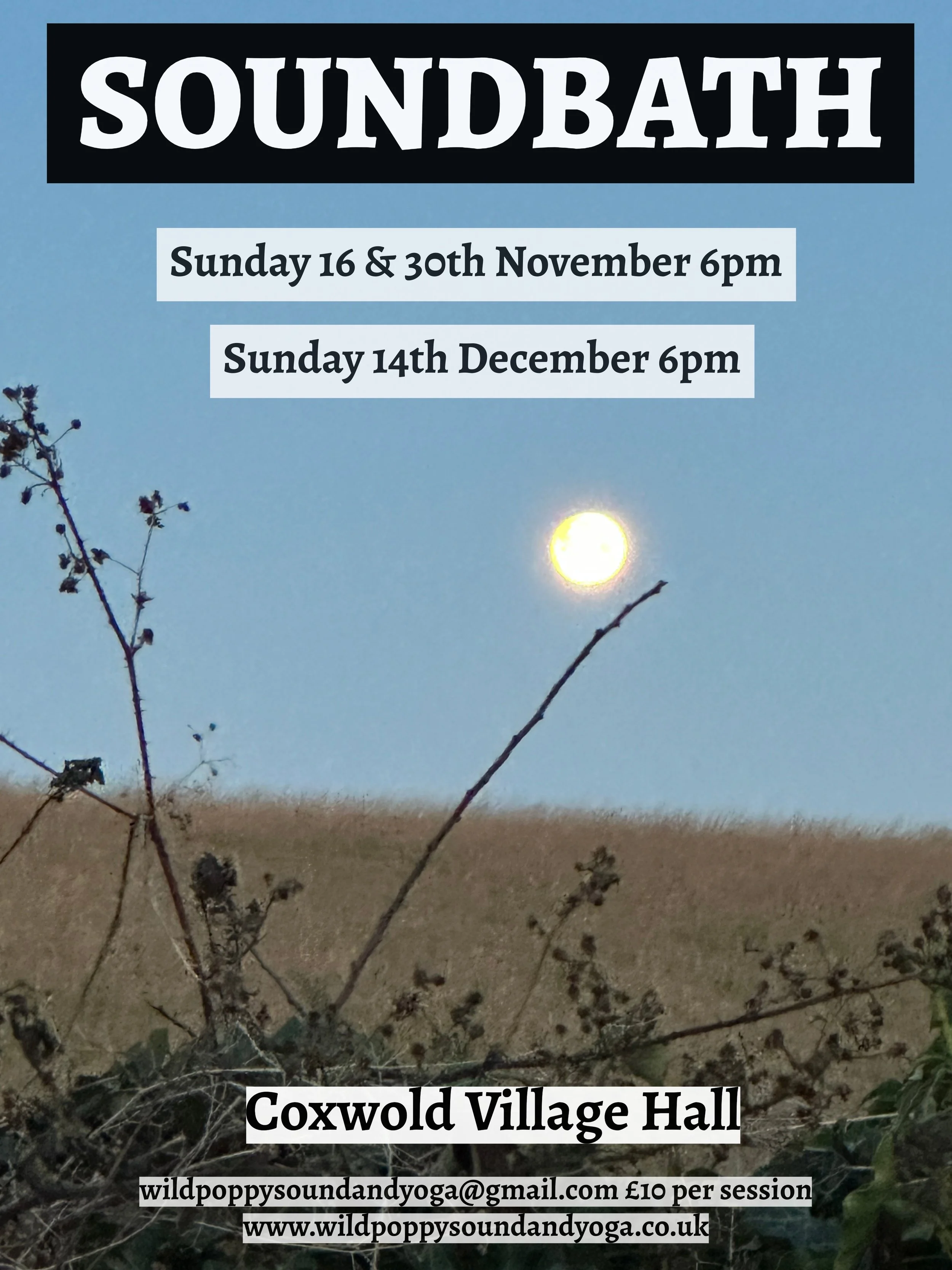 Email wildpoppysoundandyoga@gmail.com to book or for more information Dec 14 Soundbath at Coxwold Village Hall Sunday 14 December 2025 18:00 18:50 Google Calendar ICS View Event → Nov 30 Soundbath at Coxwold Village Hall Sunday 30 November 2025 18:00 18:50 Google Calendar ICS View Event → Nov 20 Soundbath at Mojo Fit Studio, Beckenham Thursday 20 November 2025 19:00 19:50 Mojo Fit Studio, Beckenham BR3 3NL (map) Google Calendar ICS View Event → Nov 16 Soundbath at Coxwold Village Hall Sunday 16 November 2025 18:00 18:50 Google Calendar ICS View Event → Oct 29 Child-friendly Soundbath at Mojo Fit Studio, Beckenham Wednesday 29 October 2025 10:30 11:30 Mojo Fit Studio, Beckenham BR3 3NL (map) Google Calendar ICS View Event → Oct 27 Child-friendly Soundbath at Coxwold Village Hall Monday 27 October 2025 10:30 11:25 Google Calendar ICS View Event → Oct 26 Soundbath at Coxwold Village Hall Sunday 26 October 2025 18:00 18:55 Google Calendar ICS View Event → Oct 23 Soundbath at Mojo Fit Studio, Beckenham Thursday 23 October 2025 19:00 19:55 Mojo Fit Studio, Beckenham BR3 3NL (map) Google Calendar ICS View Event → Oct 22 Child-friendly Soundbath at Mojo Fit Studio, Beckenham Wednesday 22 October 2025 10:30 11:25 Mojo Fit Studio, Beckenham BR3 3NL (map) Google Calendar ICS View Event → Oct 8 Soundbath at Coxwold Village Hall Wednesday 8 October 2025 18:00 18:55 Google Calendar ICS View Event →